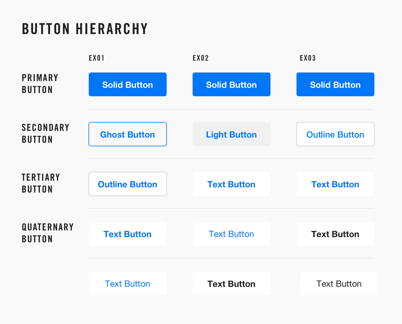 솔리드 버튼을 사용한다. 화면에서 가장 강력한 클릭 유도 문안 call to action을 강조하기 위해 기본 버튼을 화면 당 하나만 있는게 좋다. 모든 화면에 필수적인 버튼은 아니다.